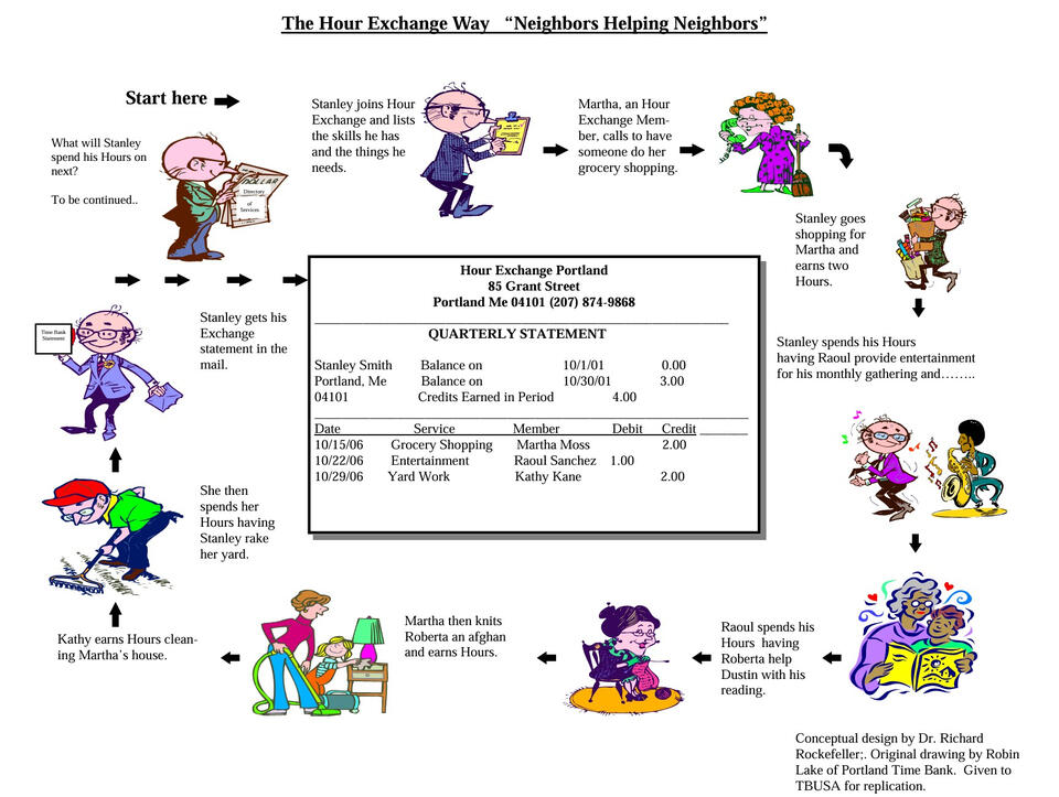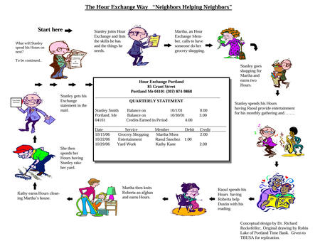 The concept is simple. For every hour of service provided to another Hour Exchange member, you earn one Time Credit. Time Credits are a community currency that members earn by using their time, energy, skills, and talents to help others. Hour Exchanging is about local individuals, organizations, or businesses helping each other in one-to-one exchanges or in group projects. Members help rebuild neighborhood networks and strengthen communities.